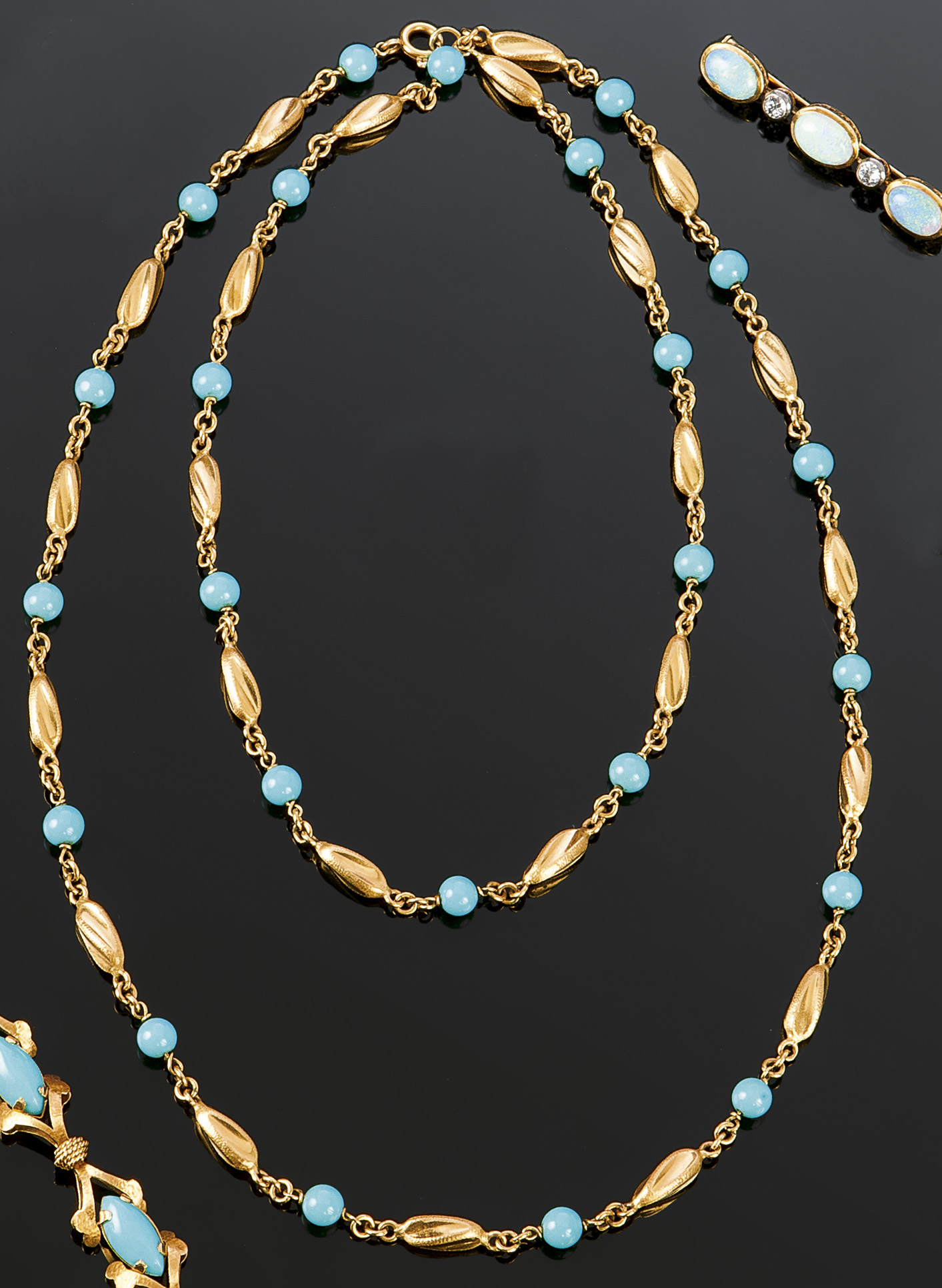 COLLANA Collana composta da barilotti di oro giallo lucido e satinato, alternati a boules di turchesi Peso gr. 38,5