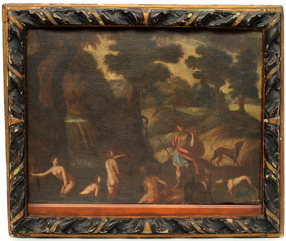 Scuola del secolo XVII, "Diana e le ninfe sorprese da Atteone" olio su tela (cm 44x57,5) in cornice (difetti e restauri)