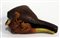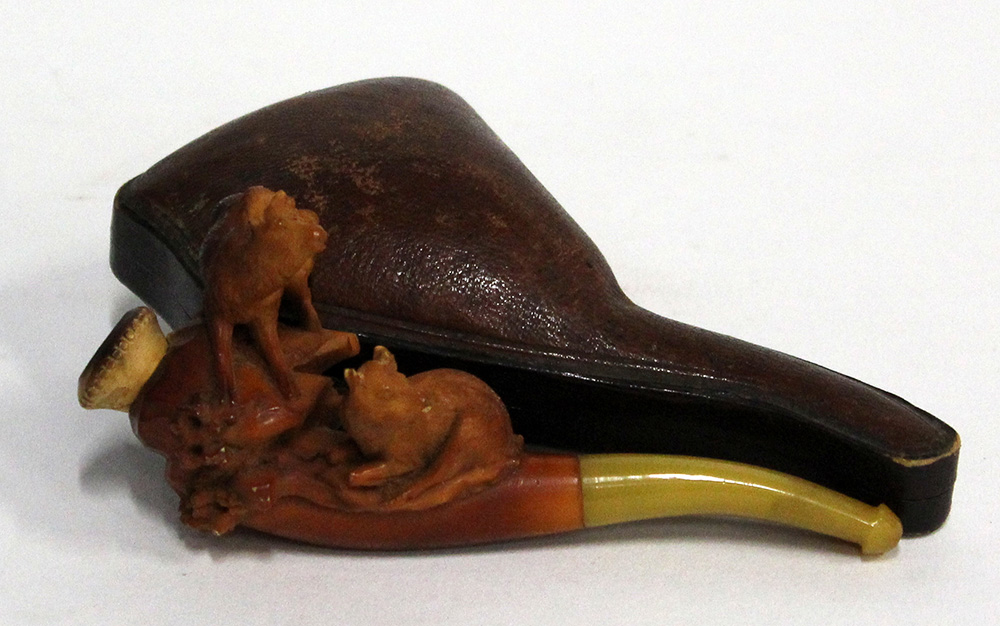 Pipa in schiuma scolpita a camosci, bocchino in ambra (cm 13) Secolo XIX. In custodia (mancanze)