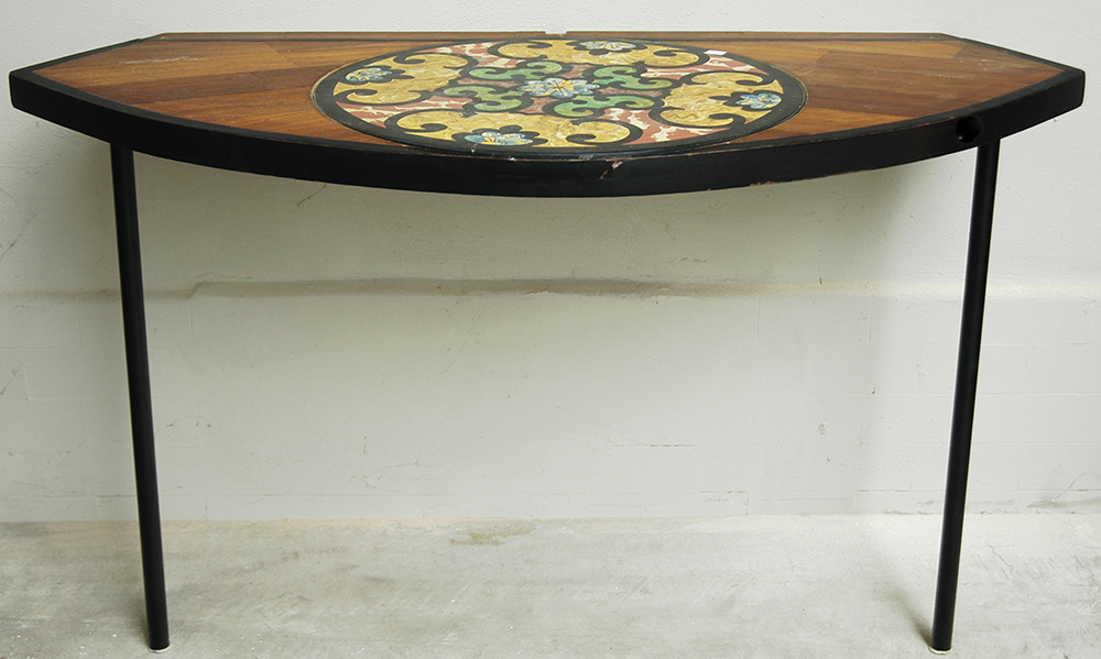 Console da parete con gambe in metallo e piano in legno con medaglione in scagliola (cm 124x72x60)