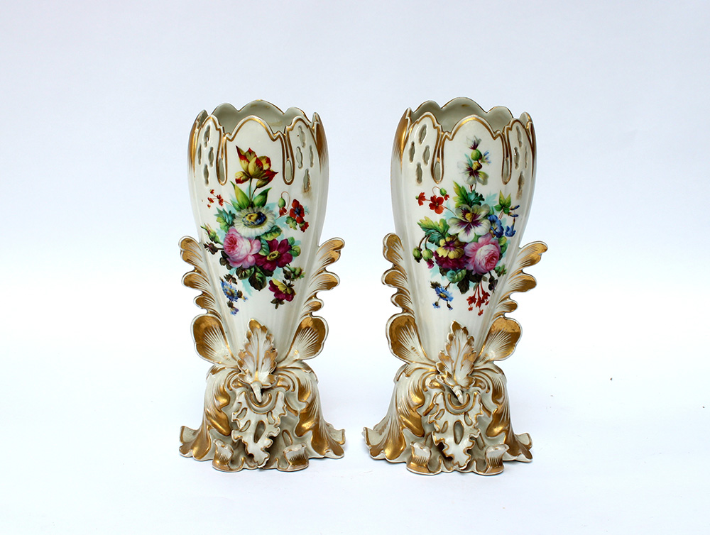 Manifattura francese del secolo XIX, coppia di vasetti portafiori in porcellana decorata in policromia a fiori e fregi dorati (h cm 28) (difetti)