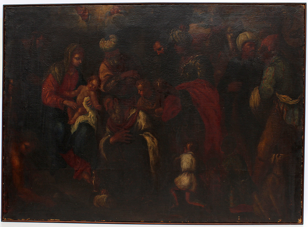 Scuola veneta del secolo XVII, "Adorazione dei Magi" olio su tela (cm 90x125) (difetti e restauri)