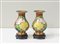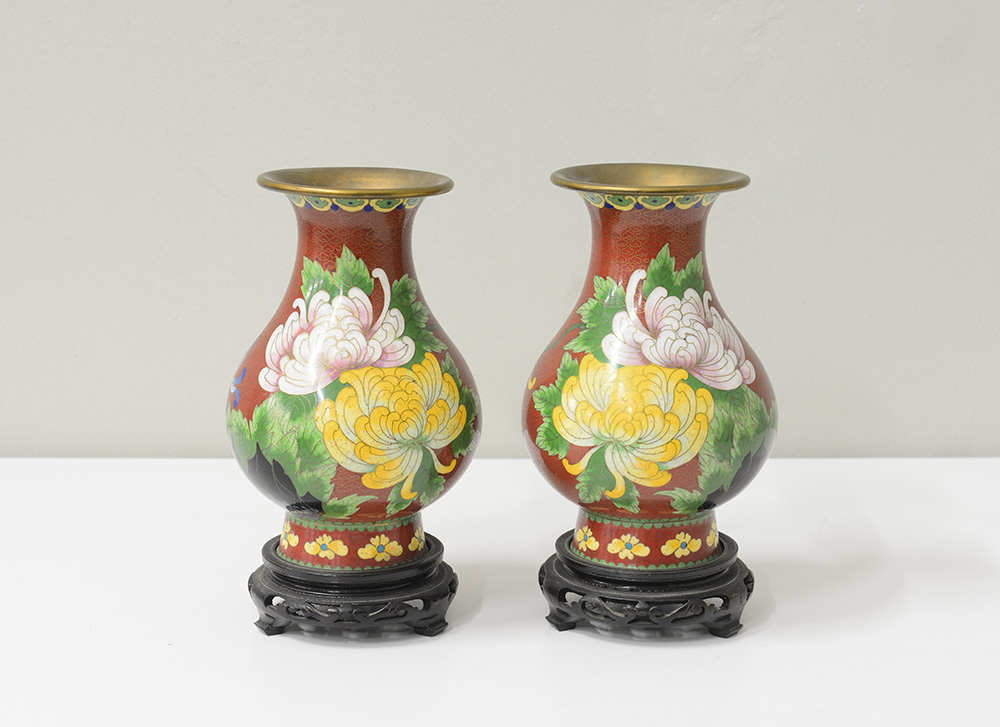 Coppia di vasi in metallo cloisonné a decoro floreale con base in legno. Cina, sec. XX (h. 23,5 cm.)