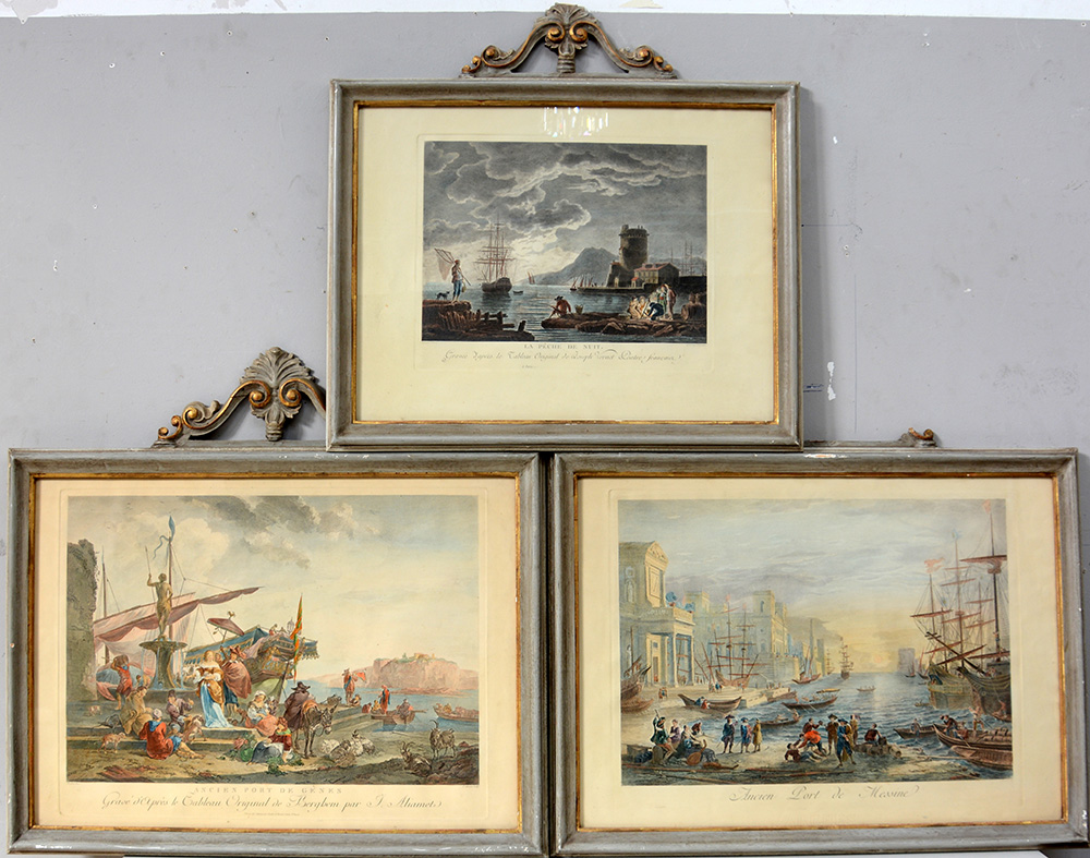 Coppia di incisioni a colori raffiguranti gli antichi porti di Genova e Messina, unite ad una terza raffigurante una scena di pesca notturna. Misure differenti, in cornici intagliate, laccate e dorate (difetti e mancanze)