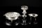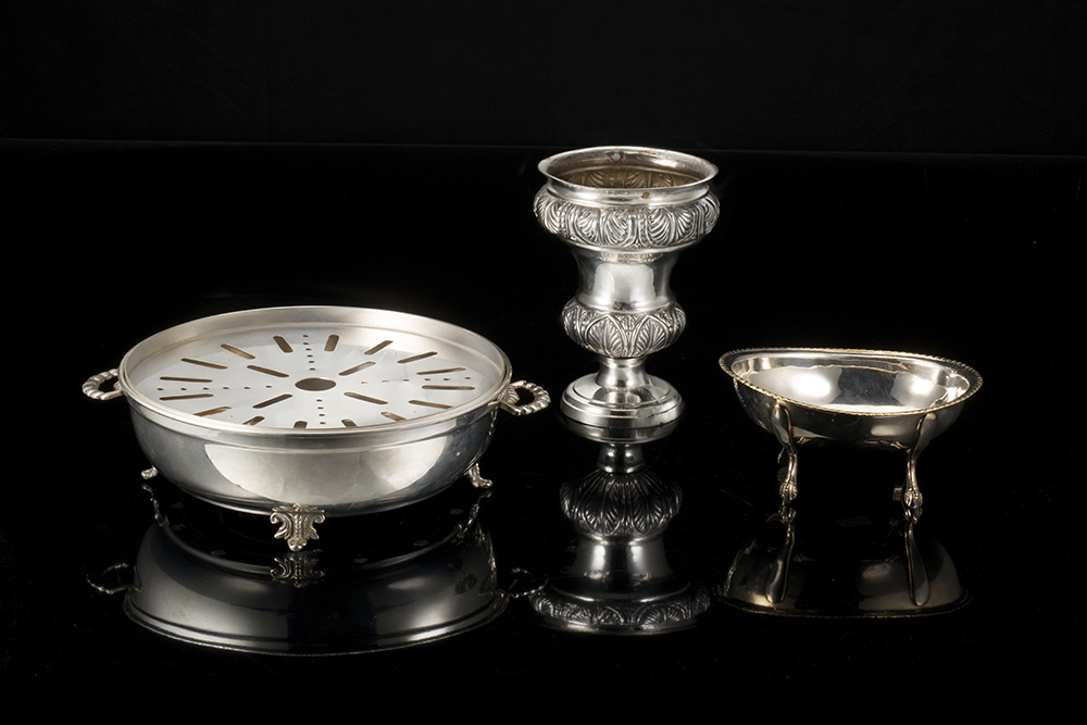 Lotto composto da uno scaldavivande, un vasetto ed un'alzatina in metallo argentato