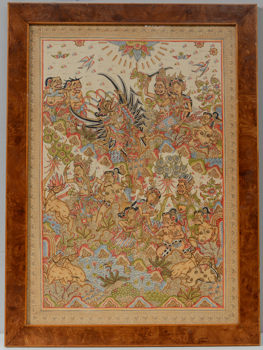 Pannello orientale inchiostro e colore su tela raffigurante scena con "Demoni e divinità", in cornice (difetti)