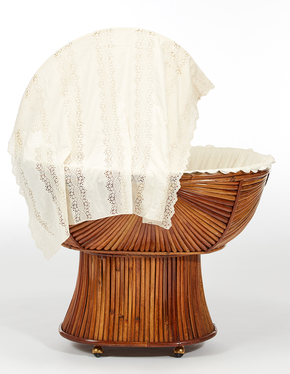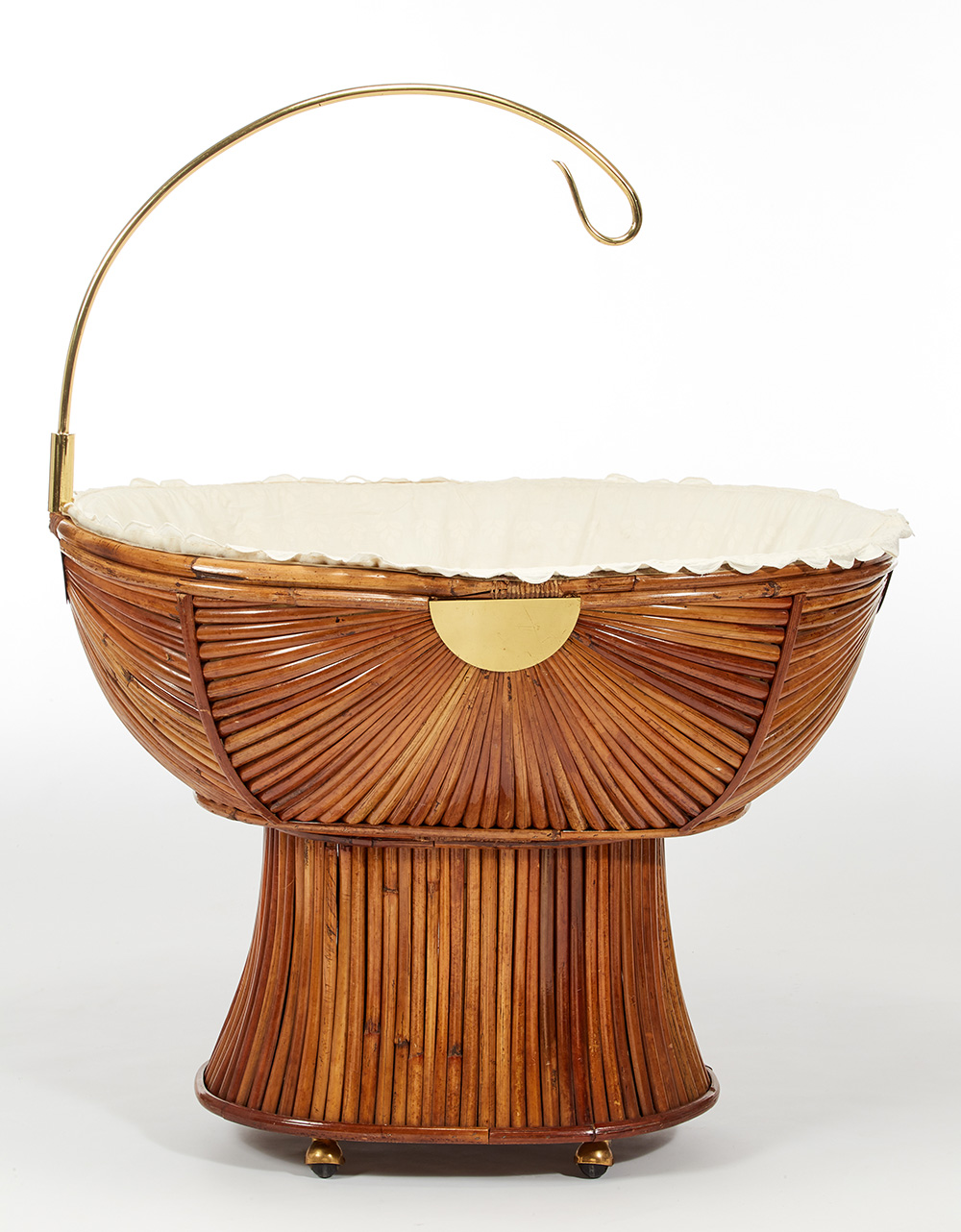Culla "Rising Sun". Milano, 1975. Canne di bambù e ottone lucidato. Parte interna rivestita in cotone ricamato a punto catenella, corredo di pizzo San Gallo in cotone con medesimo decoro. (cm 110x135x78) (lievi difetti)