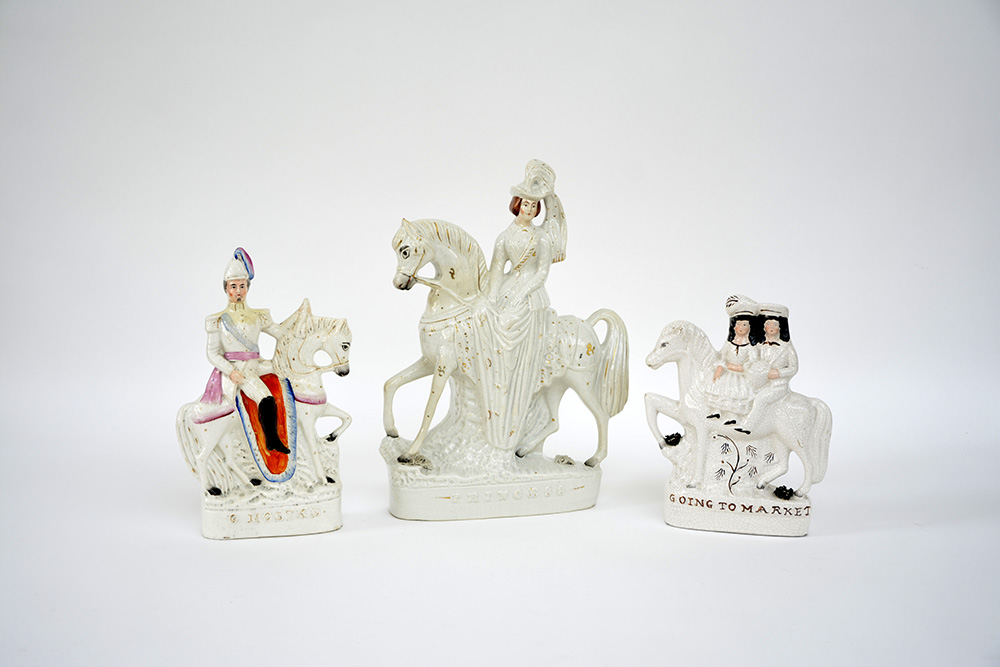 Manifattura di Staffordshire sec. XIX. Gruppo di tre statuette in porcellana raffiguranti statuette a cavallo