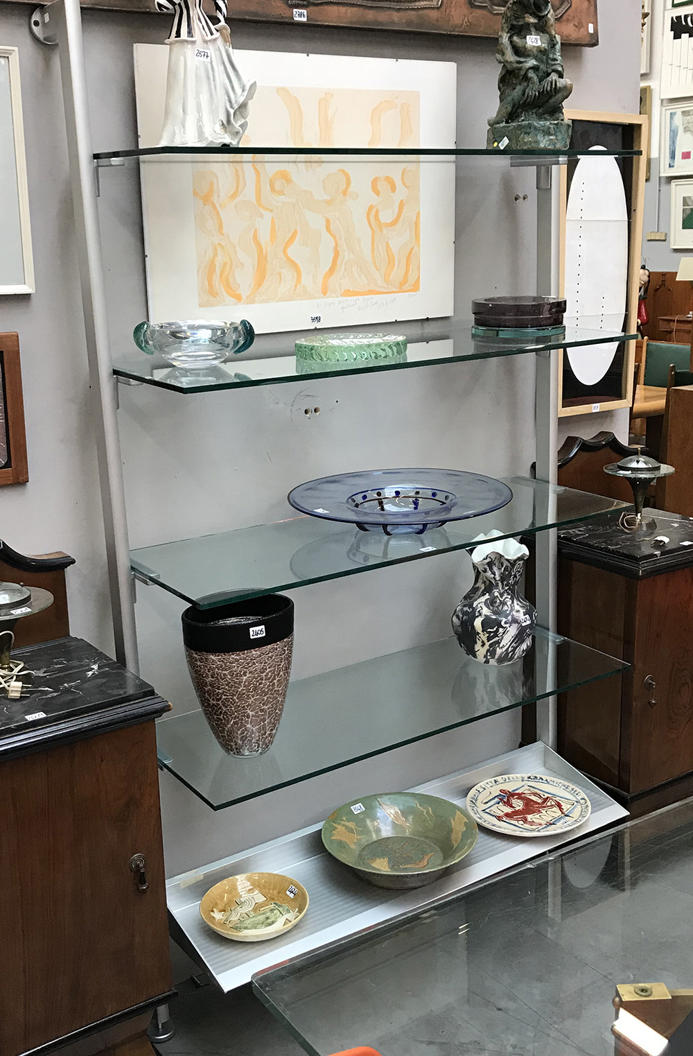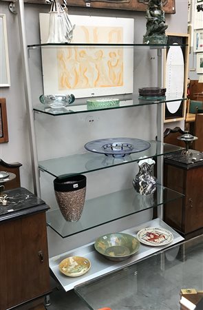 Libreria con ripiani in cristallo e alluminio anodizzato, montanti in alluminio anodizzato. Produzione recente, Italia.
