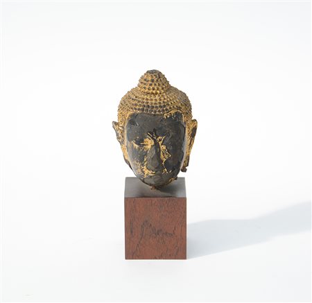 Testa di Buddha in bronzo dorato su base in legno. Manifattura dell'Asia Sud-orientale (difetti) (h. 12 cm.)