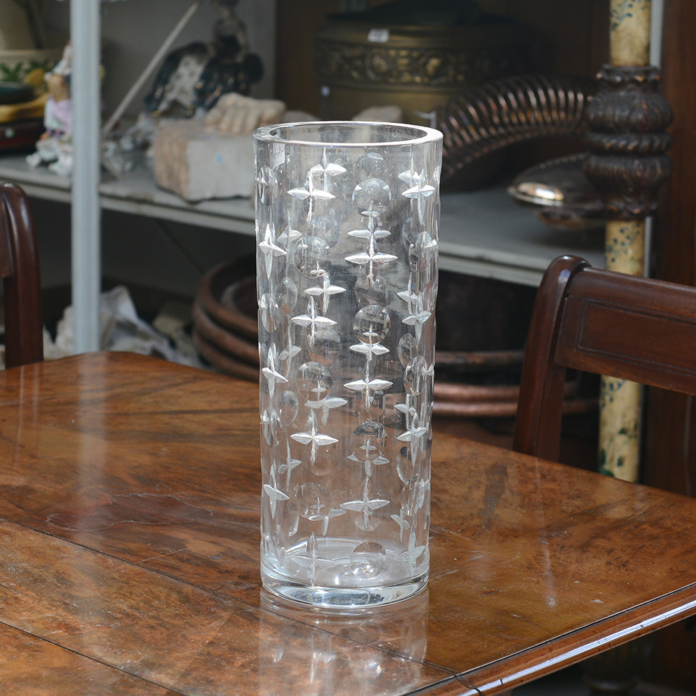 Vaso cilindrico in cristallo con decoro a sfere e stelle (h cm 30) (difetti)