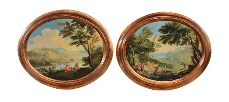 Coppia di antichi dipinti ovali ad olio su tela (cm 35x44) raffiguranti "Scena di caccia" e "Scena romantica", in cornici (lievi difetti)