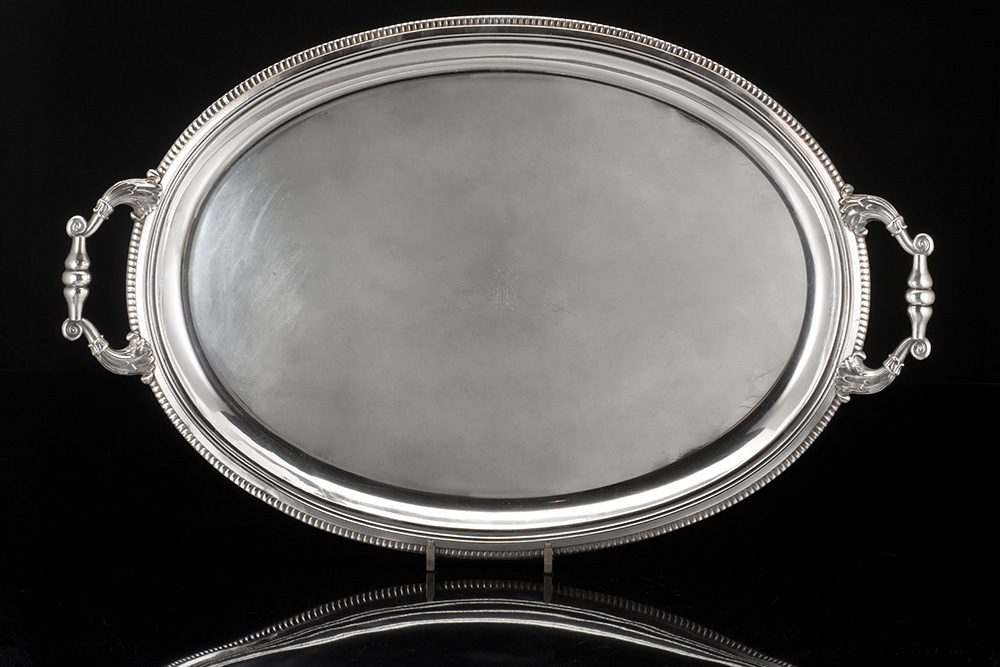 Vassoio in metallo a due manici di forma ovale con fondo liscio inciso da monogramma, bordura godronata e manici a battente con attacchi a cornucopia (l. cm 69 ca.)
