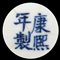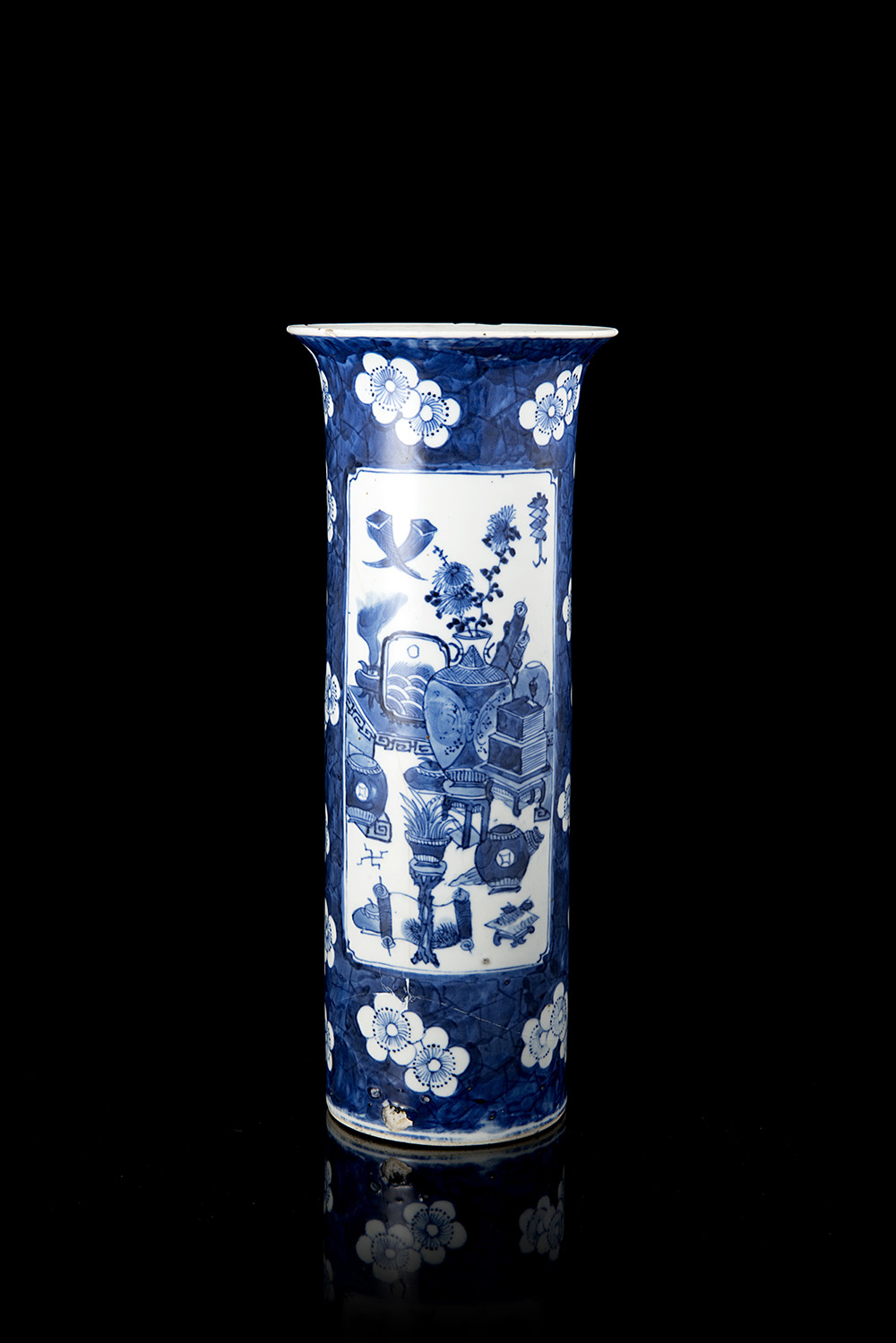 Vaso a tromba in porcellana bianca e blu decorato con il tema dei cento oggetti antichi, alla base marchio apocrifo Kangxi