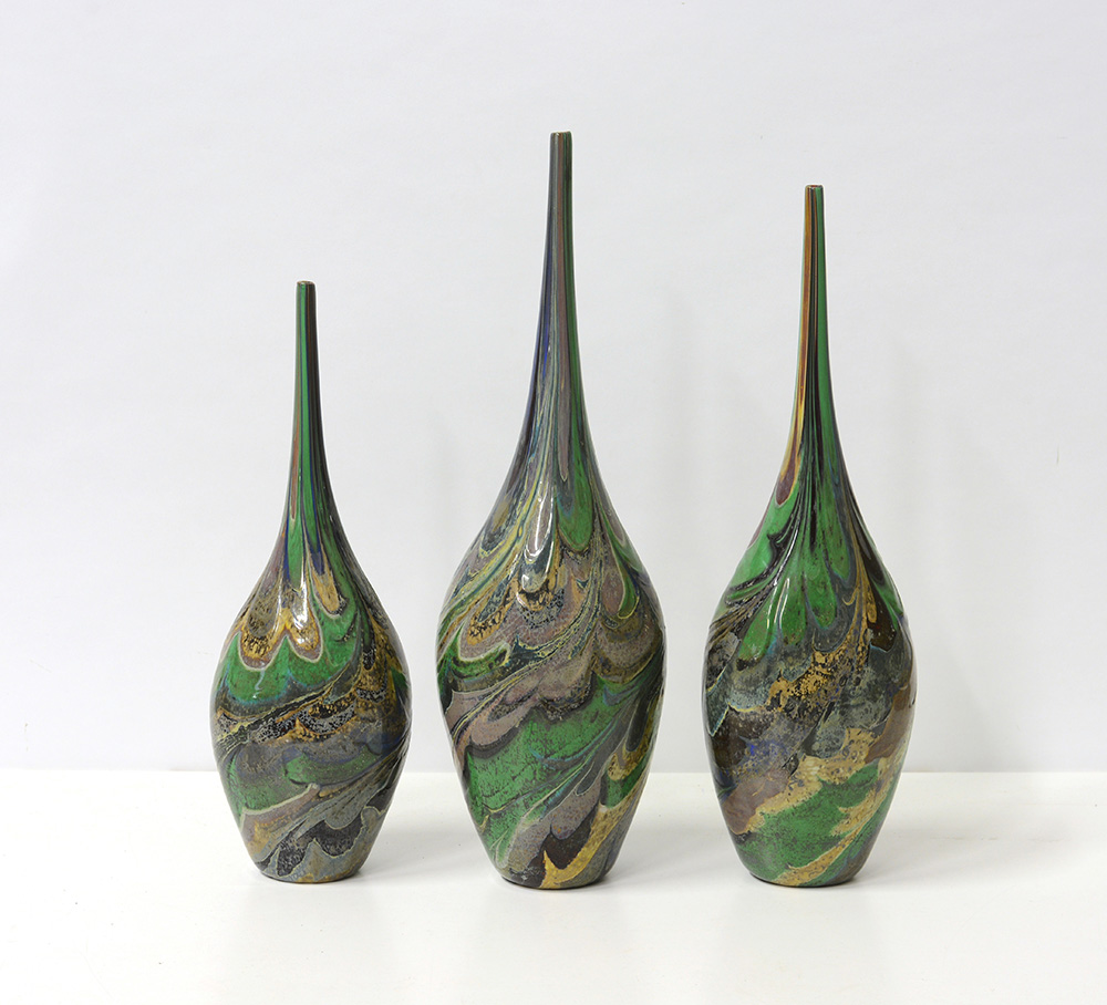 Gruppo di tre bottiglie in vetro soffiato a macchie policrome con prevalenza di toni verdi rosati e beige. Esecuzione recente. (h cm 52,5)