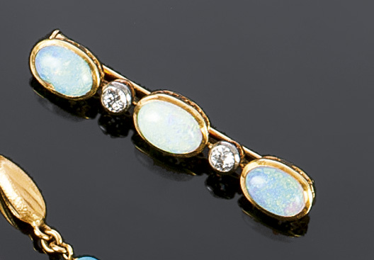 SPILLA Spilla in oro giallo, inizi XX secolo, con tre opali di taglio ovale e...