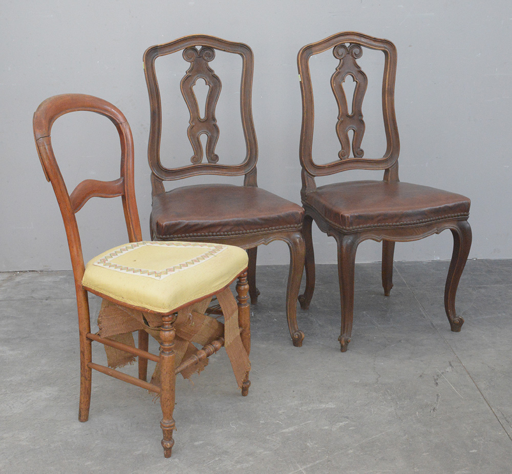 Lotto composto da tre sedie con schienali sagomati e traforati (difetti)