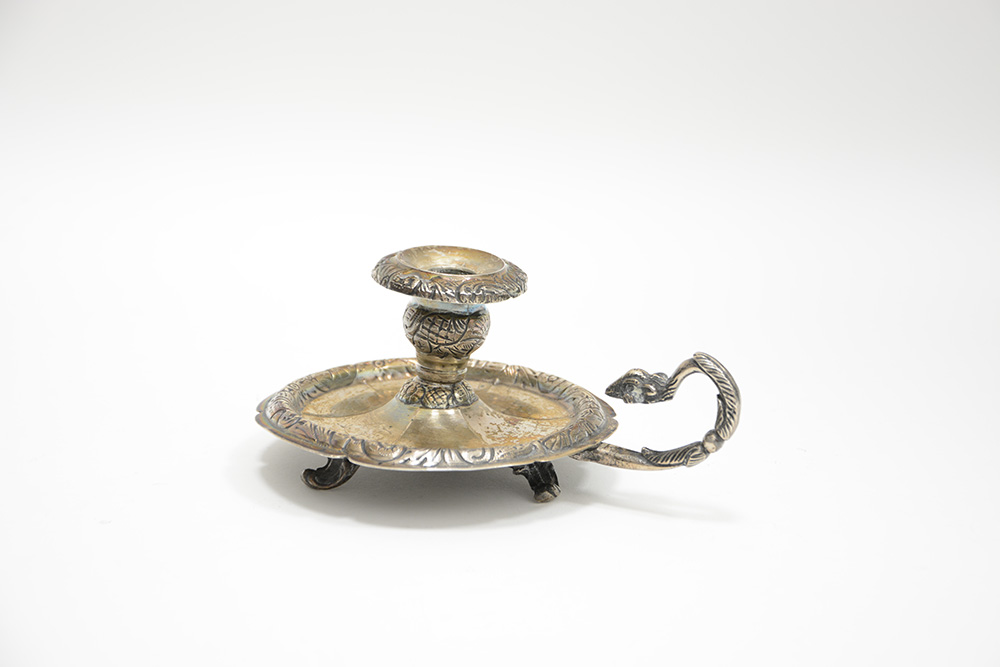 Bugia in argento decorata in rilievo a volute e motivi floreali, manico a testa d'ariete (gr 150 circa) (difetti)