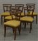 Gruppo di sei sedie in noce con gambe a sciabola, schienale a giorno con filettatura in ottone e piccoli umboni laterali, seduta imbottita in tessuto giallo (difetti).
