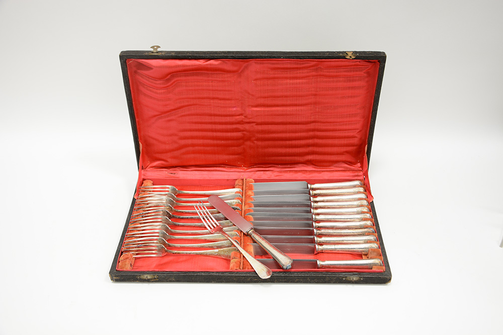 Servizio da frutta composto da dodici coltelli e undici forchette in metallo argentato decorato con monogrammi, marcato Christofle. In custodia originale (difetti)