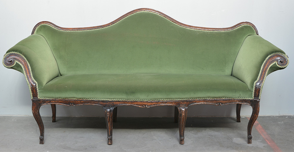 Divano 'a orecchioni' in noce con schienale e braccioli sagomati. Secolo XVIII (largh. cm 233) (difetti e restauri)