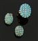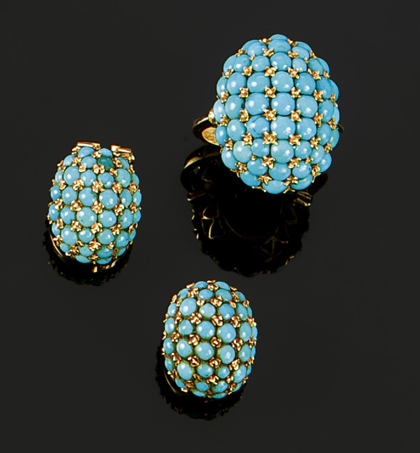 DEMI-PARURE Demi-parure in oro giallo composta da anello e coppia di orecchini (a clips), di forma ovale, sommità con piccole boules di turchesi. Peso complessivo gr. 18 Anello misura 14