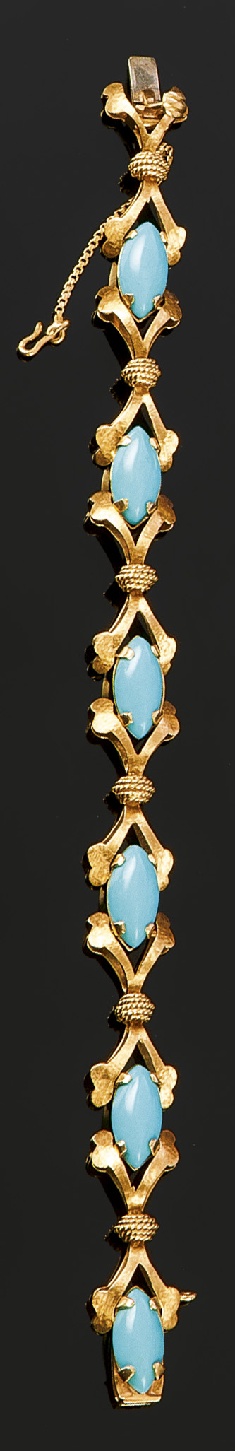 BRACCIALE Bracciale in oro giallo composto da maglie satinate con al centro sei turchesi di taglio ovale Peso gr. 19,7 Lungh. cm 19