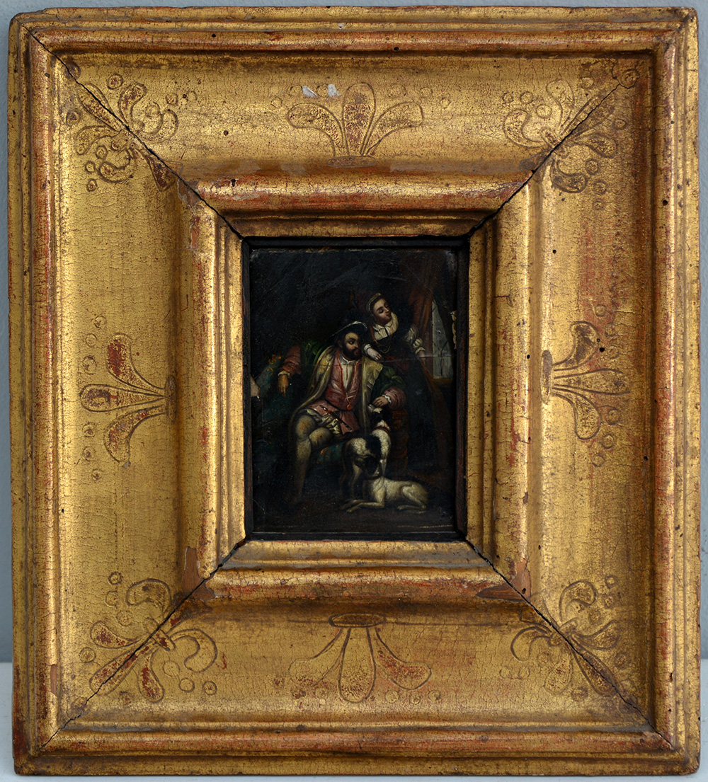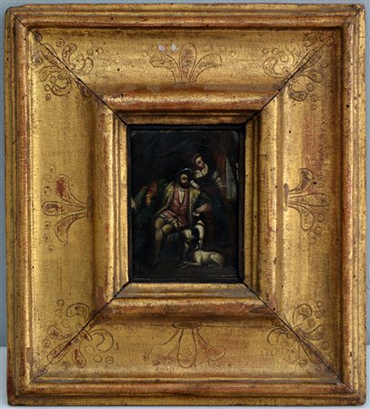 Ignoto del secolo XIX "Scena galante d'interno" olio su tavola (cm 10,5x7,5) in cornice del secolo XVII in legno dorato e bulinato (difetti e mancanze)