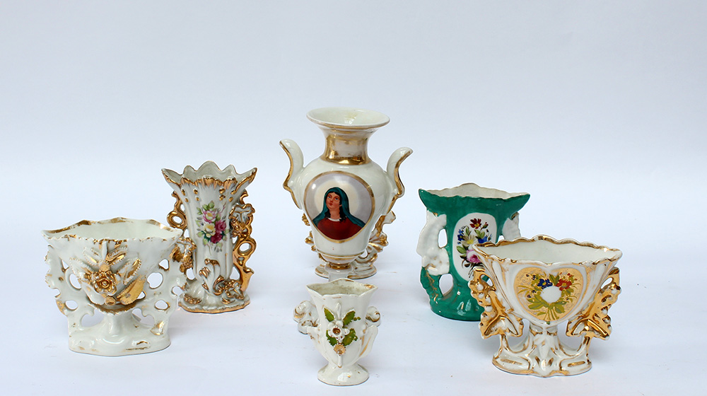 Manifattura francese del secolo XIX, lotto di sette piccoli vasetti portafiori in porcellana decorata in policromia a fiori, volto di donna e fregi dorati, misure diverse (difetti)