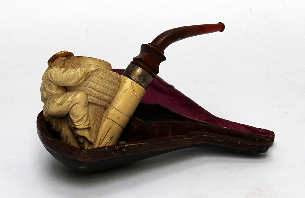 Pipa in schiuma scoplita a figura maschile, bocchino in ambra. Secolo XIX (cm 17) In custodia (difetti)