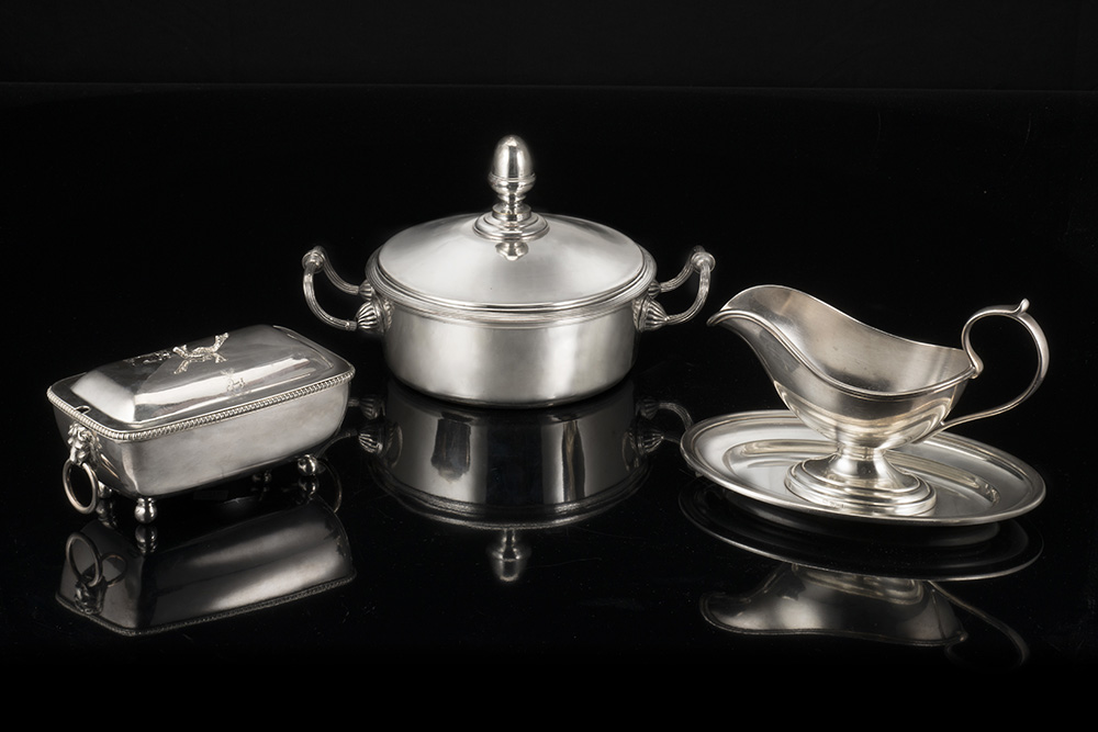 Lotto composto da una burriera, una pentola biansata con coperchio e una salsiera