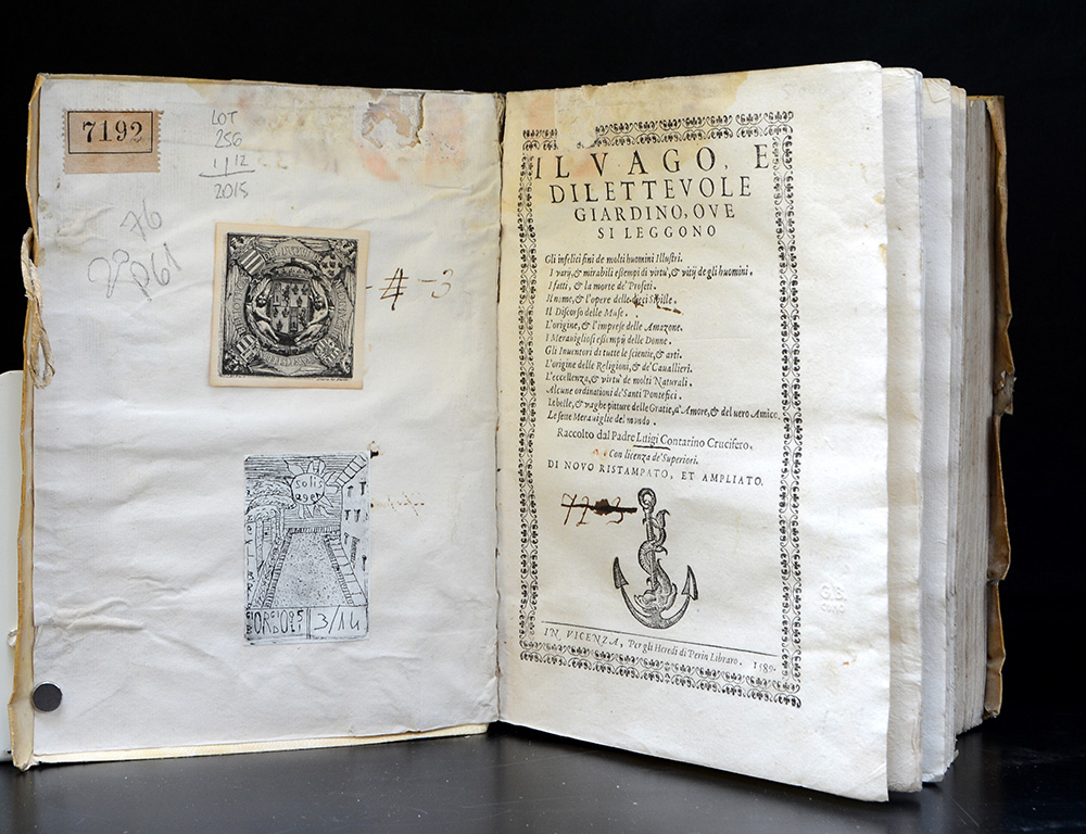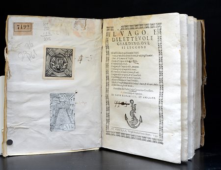 CONTARINI, Luigi. Il vago, e dilettevole giardino. Vicenza: eredi di Perin libraro, 1589. [Legato con:] Aggiunta al vago, e diletteuole giardino. Vicenza: eredi di Perin libraro, 1590. 2 opere in un volume, 4to, collazionato e completo a parte ultima carta della seconda opera, probabilmente bianca. Frontespizi in cornice tipografica con marca al centro, tutti inciso su legno, capilettera xilografici (forte alone nel margine superiore delle prime 50 carte circa che va pian piano attenuandosi). Legatura coeva in pergamena floscia con unghie, titolo manoscritto al dorso, resti di bindelle (gora al piatto anteriore).