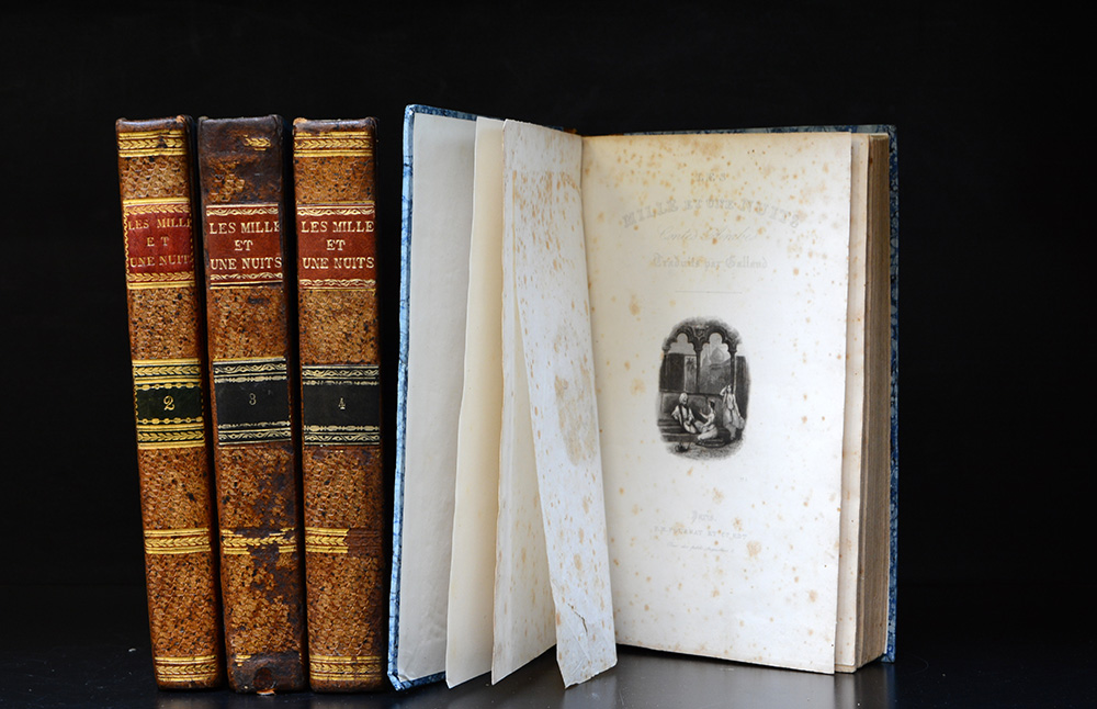 GALLAND, Antoine (trad.) - Les mille et une nuits, contes arabes. Parigi: Pourrait et Cie, 1839. In 8vo (esemplare fortemente brunito e fiorito). Legatura con dorso in pelle e piatti marmorizzati (lievi difetti). [4 voll.]