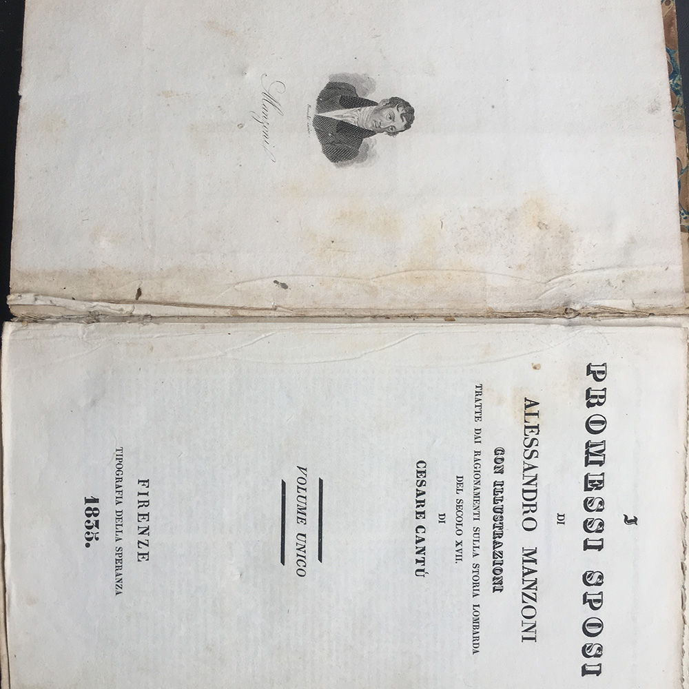 MANZONI, Alessandro - I Promessi Sposi con illustrazioni. Firenze: Tipografia della Speranza, 1835. In 8vo (difetti). Cartone marmorizzato marrone e verde (difetti).