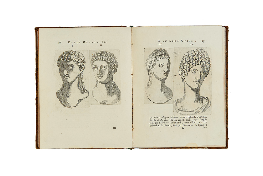 First edition of this curious monograph on the history of women's hairstyles, accompanied by many illustrations drawn from literary and iconographic sources.