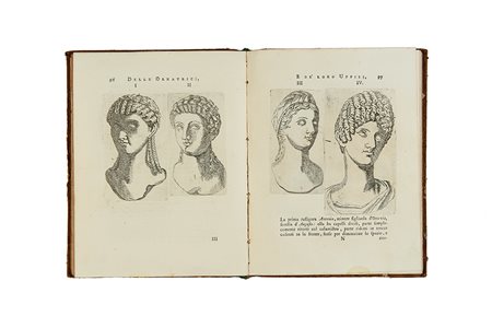 GUASCO, Francesco Eugenio (1725-1798) - Delle ornatrici e de' loro uffizi. Napoli: Giovanni Gravier, 1775. Prima edizione di questa curiosa monografia sulla storia e sul costume delle chiome femminili, corredata da numerose tavole tratte dalle fonti letterarie e iconografiche. 4to (262 x 205mm). Iniziali e fregi xilografici, 82 illustrazioni incise nel testo (frontespizio restaurato nel margine interno, mancano *2 e ?1 [quest'ultima contenente l'appendice], alcune macchie di cera, gore d'acqua a fine volume). Legatura coeva in mezza pelle (sfregata, lievi difetti). Provenienza: ex-libris al contropiatto anteriore del Conte Antoine Facipecora Pavesi con il motto "Pour un desir".