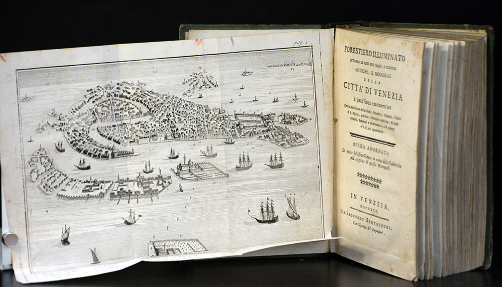 ALBRIZZI, Giovanni Battista, Forastiero illuminato intorno alle cose della città di Venezia. Venezia, Bertazzoni, 1795. Volume in 8vo, rilegatura posteriore, dorso in pelle. Lievi difetti interni. Numerose illustrazioni alcune carte più volte ripiegate, graziosa mappa di Venezia