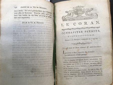 SAVARY, Claude - Le Coran traduttore de l'Arabe. Amsterdam, Leida, Rotterdam, Utrecht: chez les libraires associés, 1786. Due voll. in 8vo piccolo, corredato della vita del profeta Maometto (fioriture e bruniture). Legatura coeva in mezza pelle; nota di possesso sul piatto anteriore (lievi difetti).