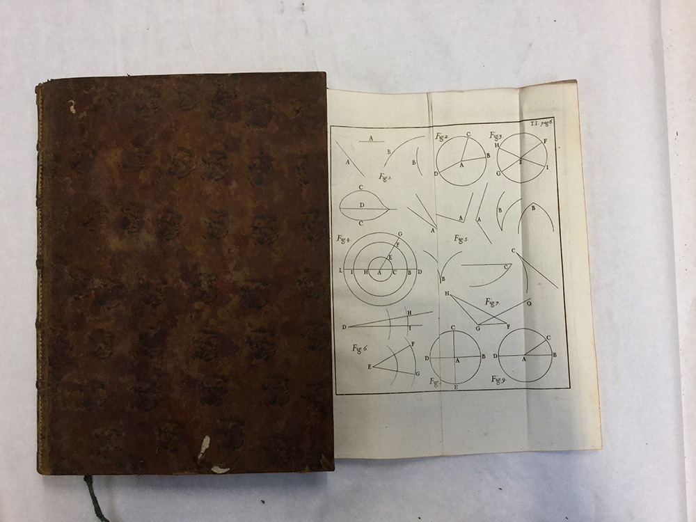 MANFREDI, Eustachio. Elementi della Geometria piana e solida e della trigonometria. Opera postuma. Bologna: Lelio della Volpe, 1755. Vol. in 4to, con bella vignetta xilografica al frontespizio e tavole fuori testo. Legatura in piena pelle, taglio rosso (lievi difetti).