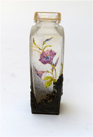 Manifattura del secolo XX, Vasetto in vetro decorato in policromia con ghiera in argento cesellato a motivi liberty (h cm 16) (difetti)