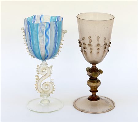 Manifattura di MuranoDue calici in vetro con fusti figurati e decorati a...
