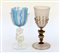 Due calici in vetro con fusti figurati e decorati a bugne. Secolo XIX/XX. (difetti)