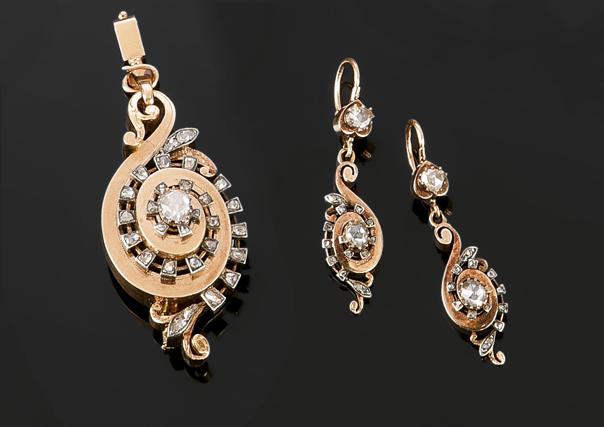 DEMI-PARURE Demi-parure, fine XIX secolo, in oro rosa e bianco, composta da una coppia di orecchini pendenti con diamanti taglio rosetta per complessivi ct 2,00 ca e da ciondolo con diamanti taglio rosetta per complessivi ct 1,80 ca Peso complessivo gr. 33,00