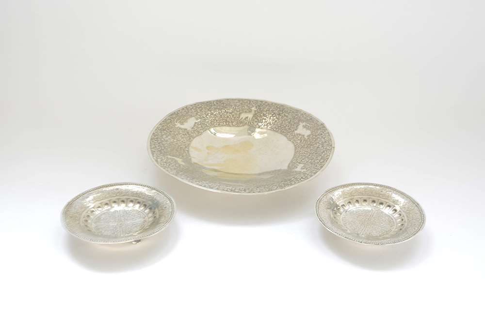 Lotto composto da un centrotavola e due alzatine in argento sbalzato a decori naturalistici (gr 520) (difetti)