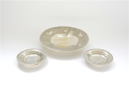 Lotto composto da un centrotavola e due alzatine in argento sbalzato a decori...