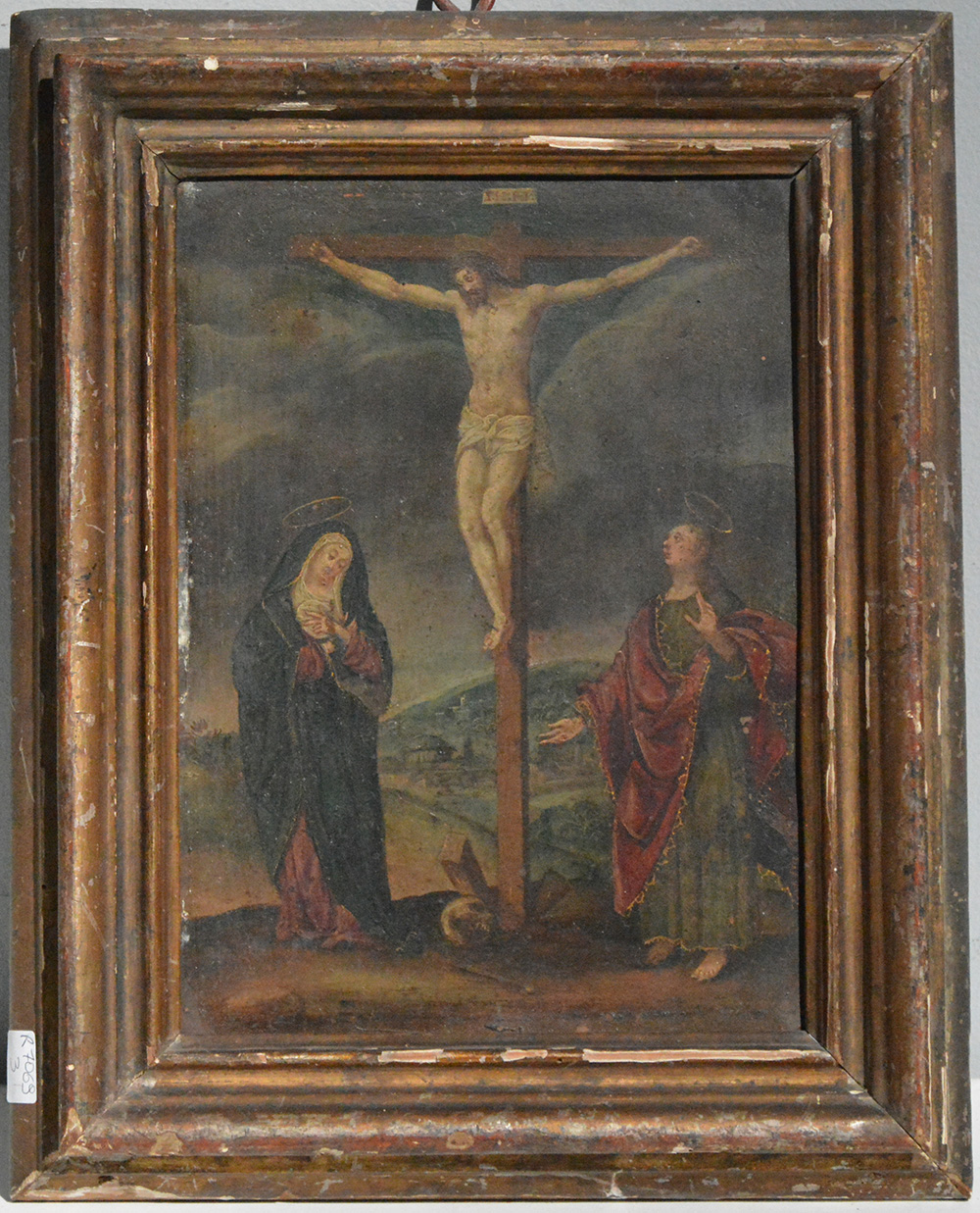 Scuola del secolo XVII, "Crocifissione con Maria Maddalena e San Giovanni...