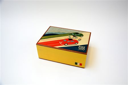 Scatola porta orologi in legno decorata con l'immagine della Fiat 500 (cm 28,5x11x21)