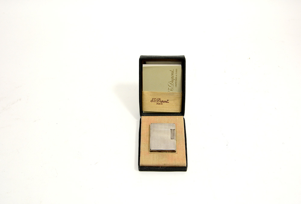Dupont, accendino in metallo argentato, completo di scatola originale e...