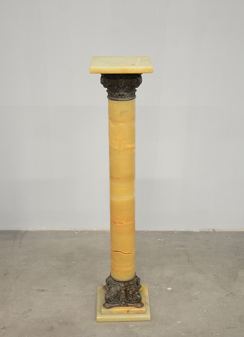 Colonna in alabastro con fusto tornito con base e capitello in legno...