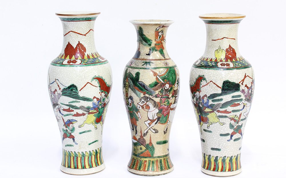 Tre vasi in porcellana, Famiglia Verde, fondo craquelè con scene di battaglia...